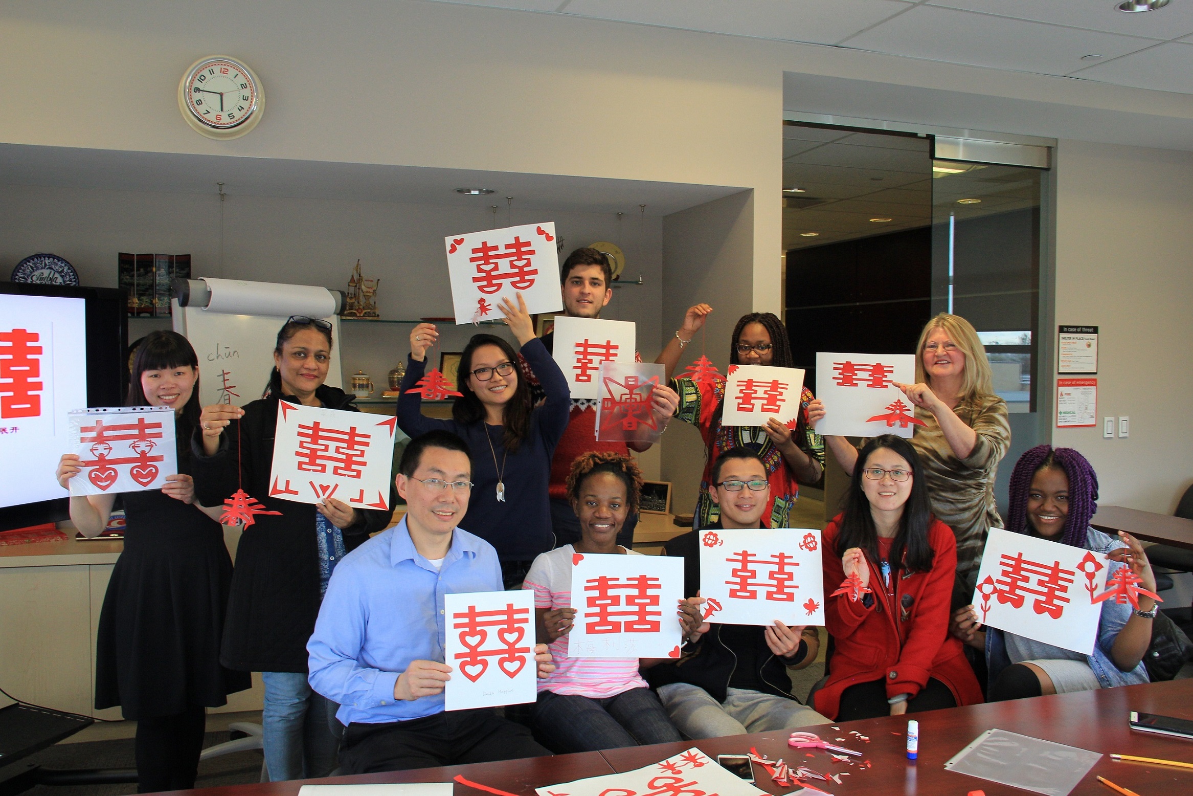 最后,大家带着自己亲手剪出的“双重幸福(double happiness)”和立体的“春天”合影纪念,为这场短暂又精致的剪纸工作坊画上了句号。