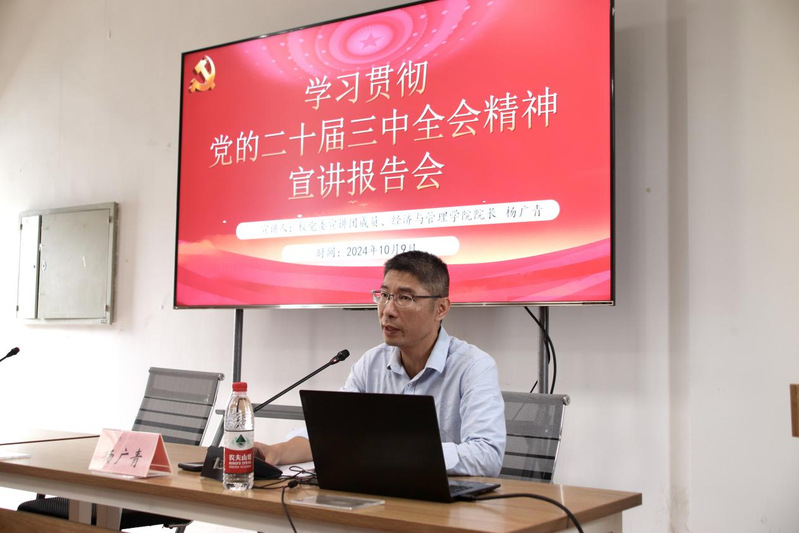 10月9日,经管学院于福万楼C401举办学习贯彻党的二十届三中全会精神宣讲会,校党委宣讲团成员、经管学院院长杨广青作相关专题宣讲报告,经管学院全体教职工参会,会议由院党委书记陈旭英主持。